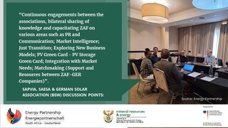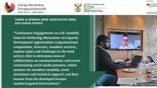 The wind, solar and energy storage clusters were represented at the dialogue by Stiftung Offshore Wind Energy [Foundation for Offshore Wind Energy], Bundesverband WindEnergie (BWE) [Federal Association for Wind Energy], Bundesverband Solarwirtschaft (BSW) [Federal Association for Solar Power] and Bundesverband Energiespeicher (BVES) [Federal Association for Energy Storage] from the German side and South African Wind Energy Association (SAWEA), South African Photovoltaic Industry Association (SAPVIA) and South African Energy Storage Association (SAESA) from the South African side.